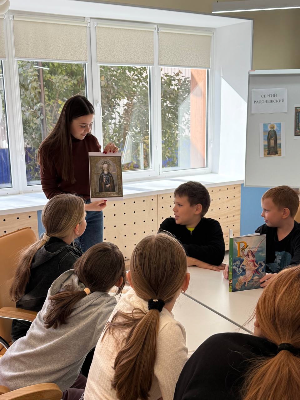 Дети с увлечением рассматривали репродукции картин, изображающих святого, а после мероприятия с интересом знакомились с книгами «Жизнь и бытие Сергия Радонежского».
